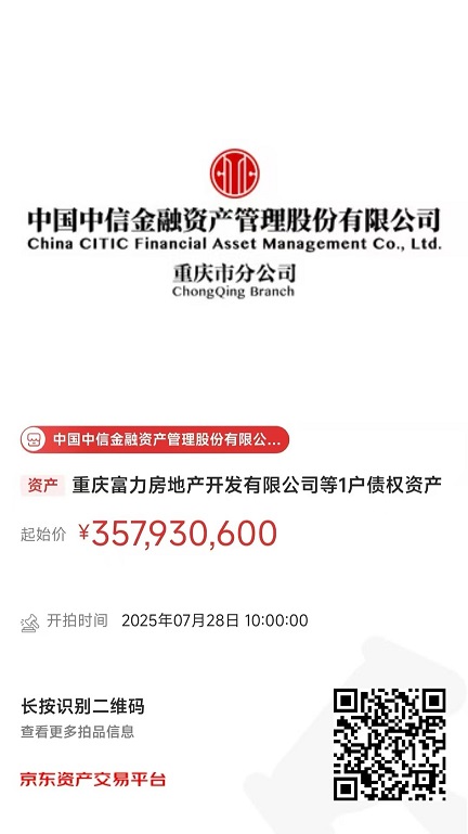 中國(guó)中信金融資產(chǎn)管理股份有限公司重慶市分公司(以下簡(jiǎn)稱(chēng)“中信金融資產(chǎn)重慶分公司”)持有的對(duì)重慶富力房地產(chǎn)開(kāi)發(fā)有限公司等1戶債權(quán)資產(chǎn)定于2025年7月28日10時(shí)至2025年7月29日10時(shí)止(延時(shí)的除外)在京東資產(chǎn)交易平臺(tái)(網(wǎng)址https://zcpm.jd.com/)進(jìn)行公開(kāi)競(jìng)價(jià)活動(dòng),拍賣(mài)鏈接如下圖所示,競(jìng)拍相關(guān)事宜詳見(jiàn)拍賣(mài)鏈接里的競(jìng)拍公告及競(jìng)拍須知,現(xiàn)予以公告。