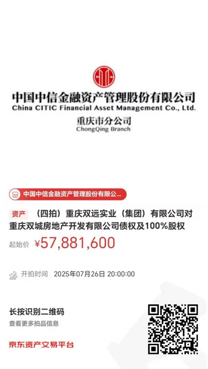 重慶雙遠實業(yè)(集團)有限公司持有重慶雙城房地產(chǎn)開發(fā)有限公司債權(quán)和100%股權(quán)。重慶雙遠實業(yè)(集團)有限公司將于2025年7月26日20時至2025年7月27日20時在京東拍賣網(wǎng)通過公開競價方式進行處置,拍賣鏈接如下圖所示,現(xiàn)予以公告。